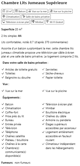L’Hôtel Exsel Créolia met un point d’honneur à l’inclusion : cette chambre est entièrement accessible en fauteuil roulant et desservie par un ascenseur performant. Pour les groupes plus importants, des chambres communicantes sont disponibles dans cette catégorie, offrant une flexibilité précieuse pour vos séjours en famille ou entre collègues. Enfin, l’ensemble du logement est strictement non-fumeur, garantissant un environnement sain et frais durant toute la durée de votre escale. Choisir la Chambre Lits Jumeaux Supérieure, c’est s’offrir le luxe de l’espace, la commodité de deux lits séparés et la magie d’un panorama maritime inoubliable au cœur de la capitale.